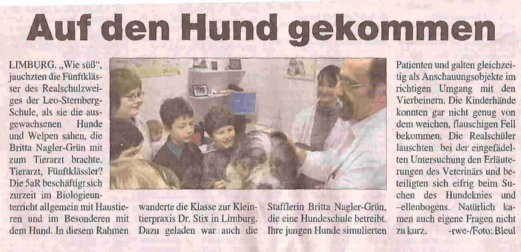 Besuch der Klasse 5 AR der Leo-Sternberg-Schule in der Praxis von Tierarzt Dr. Stix in Zusammenarbeit mit unserer Hundeschule zum Thema “Hund” |